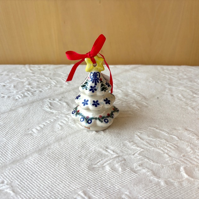 手のひらサイズの小さなクリスマスツリー。置物としてはもちろん、オーナメントとしてツリーに飾り付けたりお気に入りの使い方が出来るアイテムです。 雪が降る中に、小さなクリスマスツリーが描かれていたり、モミの木の枝葉がデザインされていたり細やかな仕事が映える絵柄です。 ※リボンの色はお選びいただけません。 ○●●○ 直径:5.5cm 高さ:8.5cm 製造元:Ceramika Artystyczna VENA(ヴェナ) 生産国:POLAND 品番:V239-B333 オーブン使用OK、レンジ使用OK、食洗機利用OK(直火NG) ※ご購入前にご一読下さい※ ポーランド食器は、昔ながらの手仕事で職人が作っているハンドメイド製品です。プリントとは違い、同じ絵柄でもひとつひとつに絵柄や表情の個体差がございます。絵柄の違い、色の濃度、スタンプの間隔の違いなど、手仕事ならではの個性も味としてお楽しみ下さい。