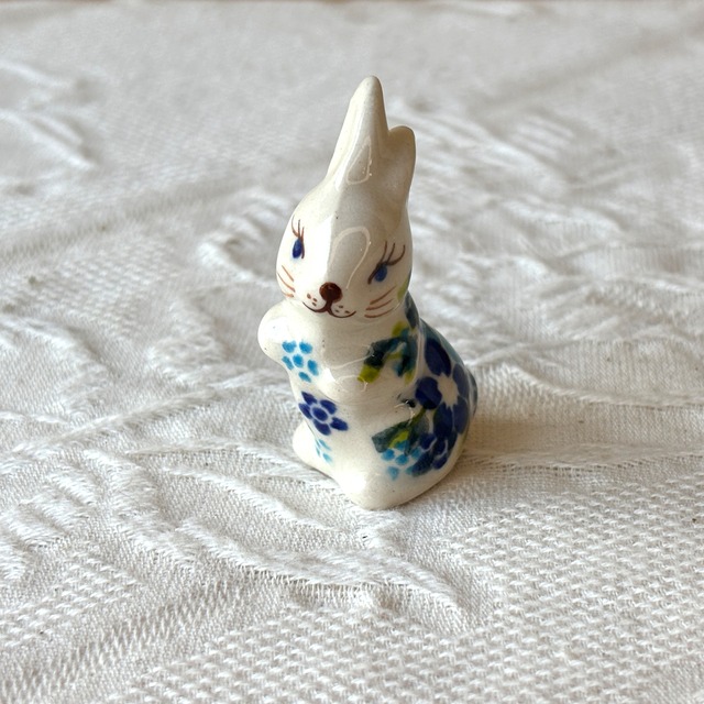ちょこんと音がしそうな可愛さで立っているのはミニバニーの置物です。置物の大きさとしては最小サイズとなっていますので、場所を選ばずに置いておけるのも魅力です。 青と水色の小花が可愛らしくデザインされた絵柄。華やかですが落ち着きもあり、老若男女問わずにご利用しやすい絵柄となっています。 ※動物のお顔は、職人が絵筆でひとつひとつ手作りで描いております。そのため、同じ絵柄でも目、鼻、ひげの大きさ、太さに違いがございます。ネットストアでお顔などはお選び頂けませんが、どの子もとても可愛いので可愛がってあげてください。 ○●●○ 高さ:5cm 製造元:Ceramika Artystyczna VENA(ヴェナ) 生産国:POLAND 品番:V810-C102 オーブン使用OK、レンジ使用OK、食洗機利用OK(直火NG) ※ご購入前にご一読下さい※ ポーランド食器は、昔ながらの手仕事で職人が作っているハンドメイド製品です。プリントとは違い、同じ絵柄でもひとつひとつに絵柄や表情の個体差がございます。絵柄の違い、色の濃度、スタンプの間隔の違いなど、手仕事ならではの個性も味としてお楽しみ下さい。