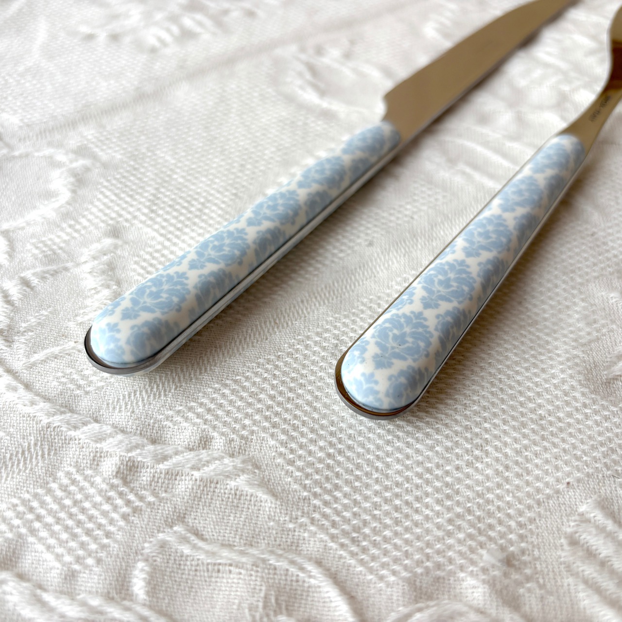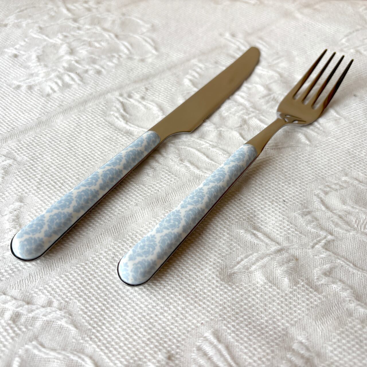 ダマスク織を彷彿とさせるパターン化されたデザインで、薄い水色が清楚な印象です。さらっとしたマットな持ち心地もおしゃれです。