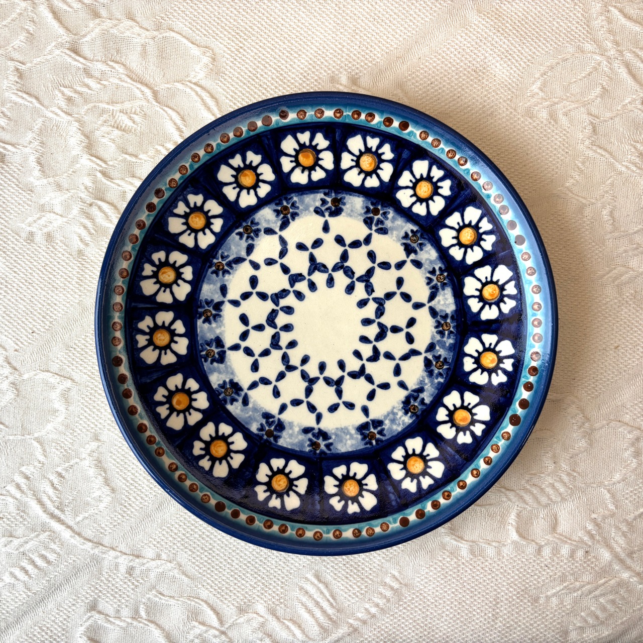 紺色を基調にカモミールが描かれた絵柄です。白いカモミールの真ん中にスタンプされている黄色もアクセントになっていて、とても愛らしいデザインになっています。ポーランド食器を知らない方でも、この柄は知っているという方も多いとても有名な柄です。