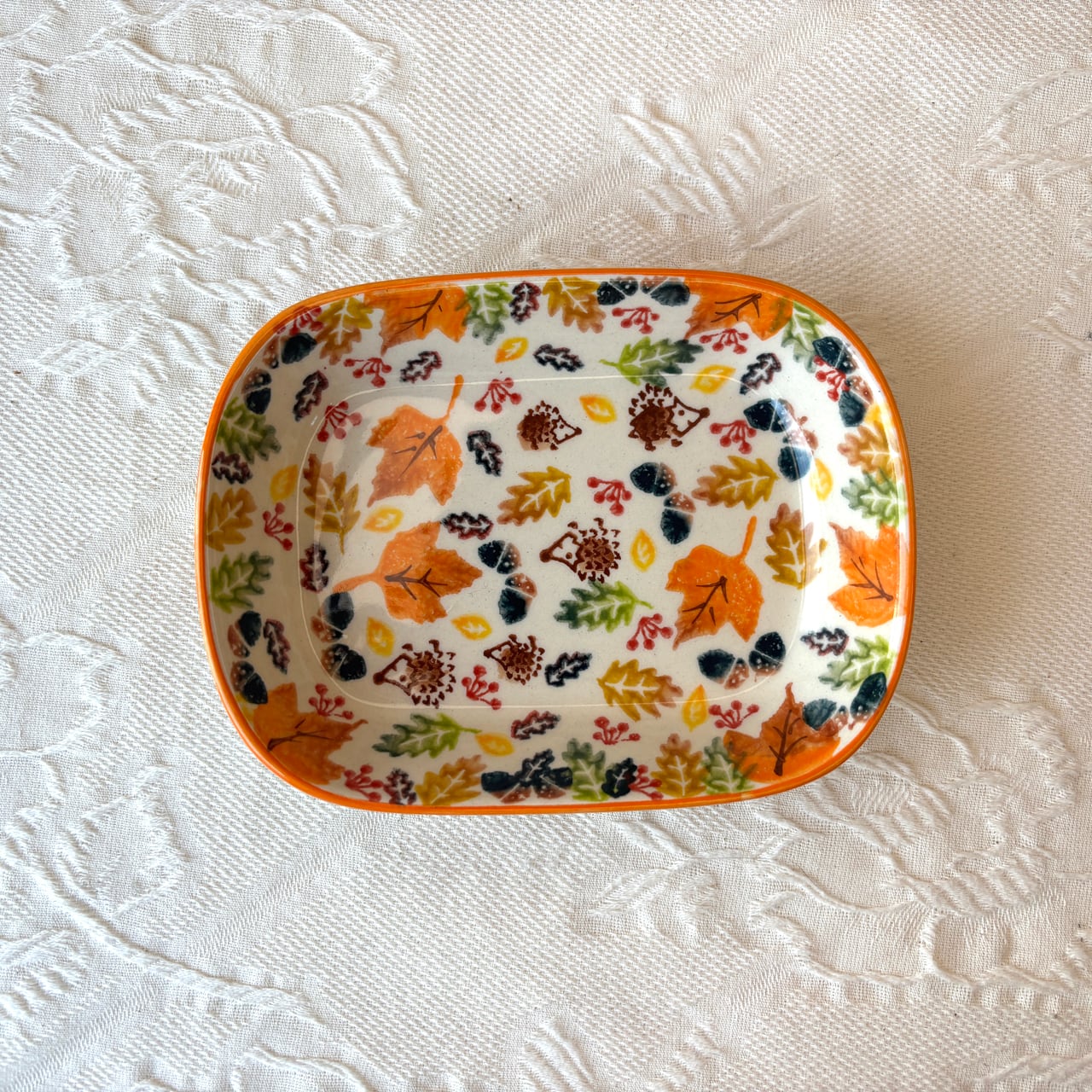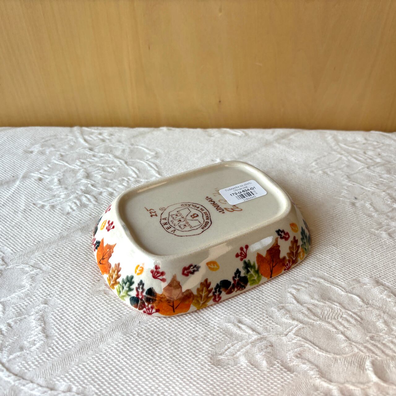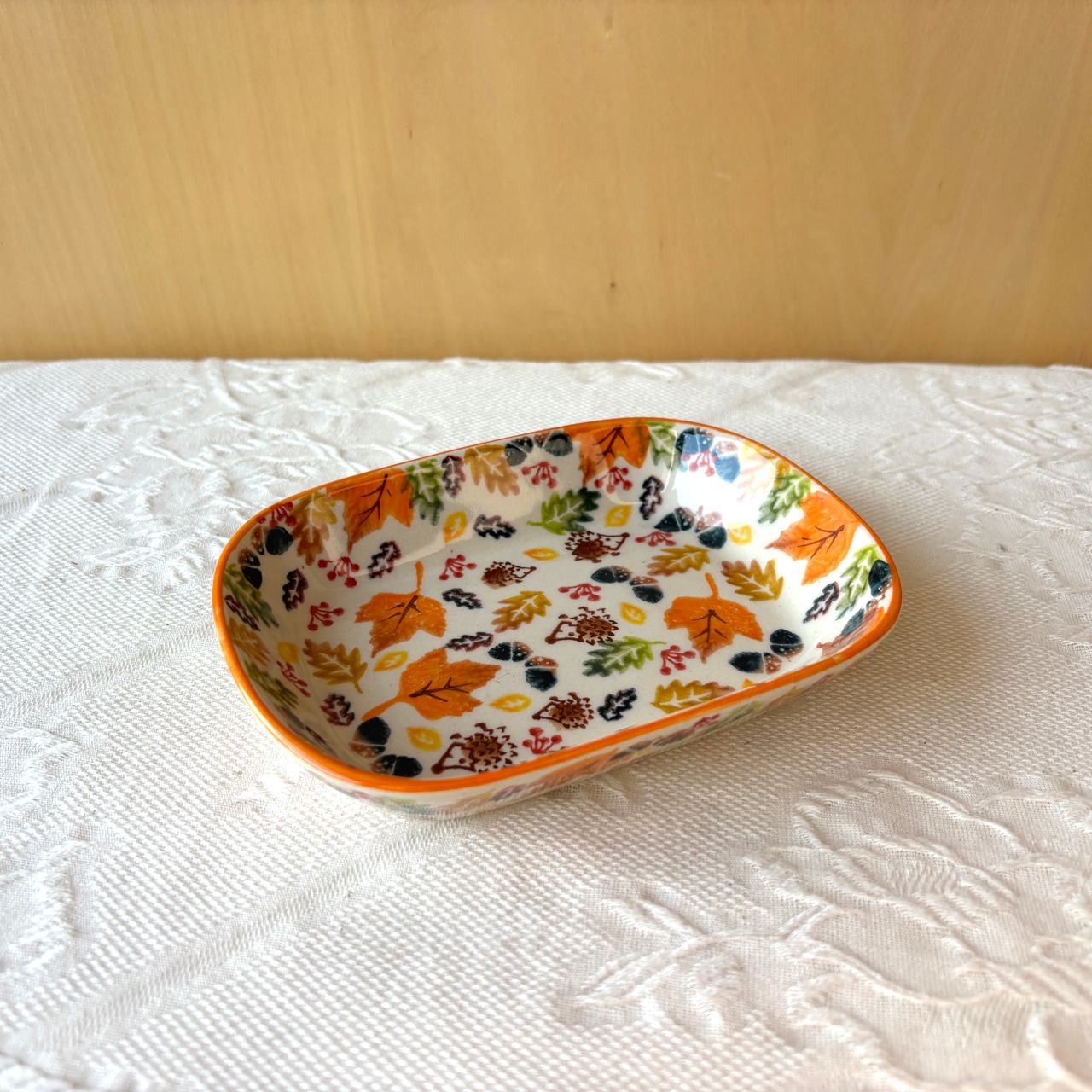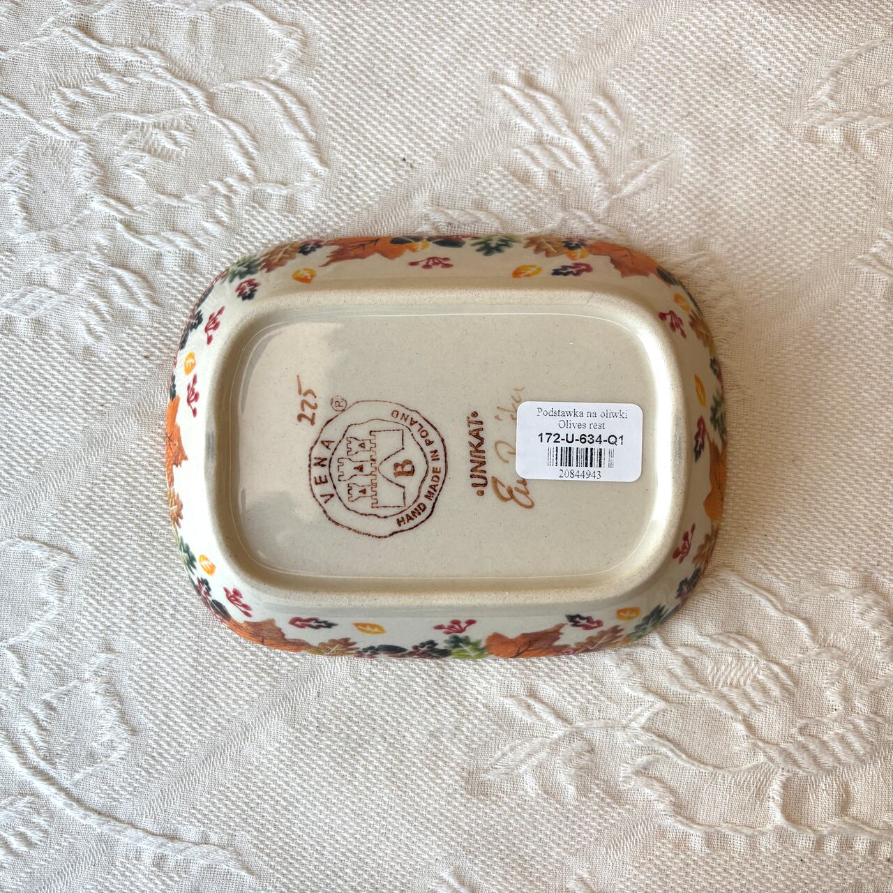 長方形の深さのあるお皿です。現地ポーランドでは「Olive rest」と名のつくプレートなので、オリーブ置きのお皿として丁度良いお皿です。日本の食卓では、小さめのおにぎりが二つほど乗せられる大きさで、深さがあるので汁気のある煮魚や煮物にもご利用頂けるかと思います。