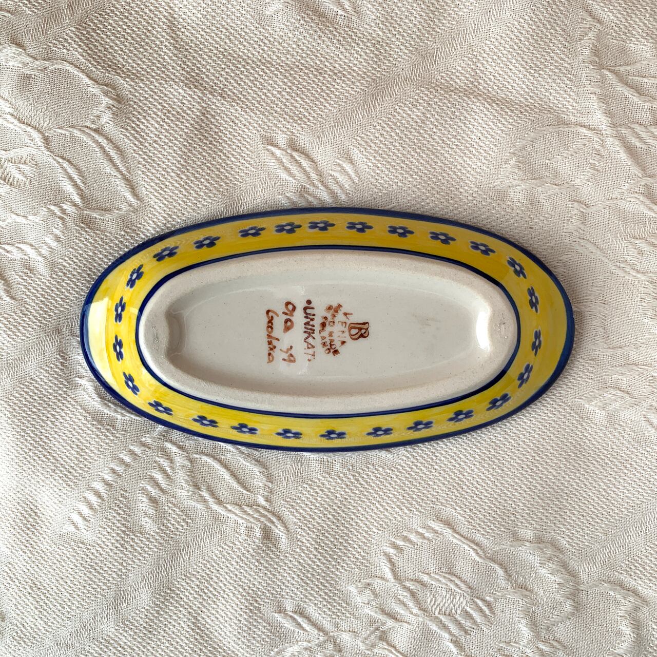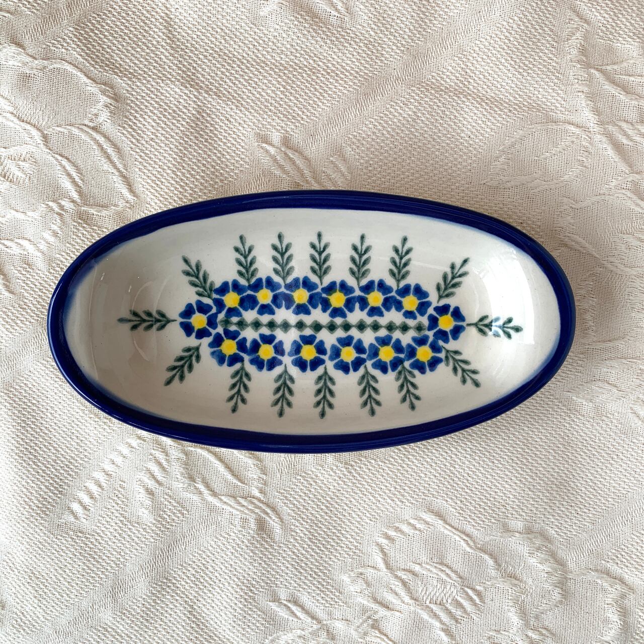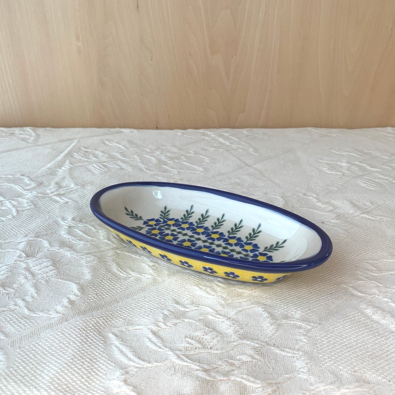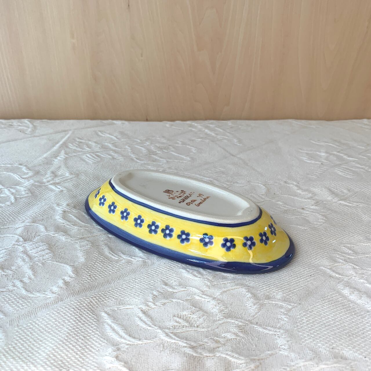 白地と鮮やかな黄色、紺色の花柄がとても華やかなこちらの絵柄。ポーリッシュポタリ―らしい素朴な可愛らしさもあり、見るだけで元気をもらえるようなデザインからとても人気がある絵柄になっています。