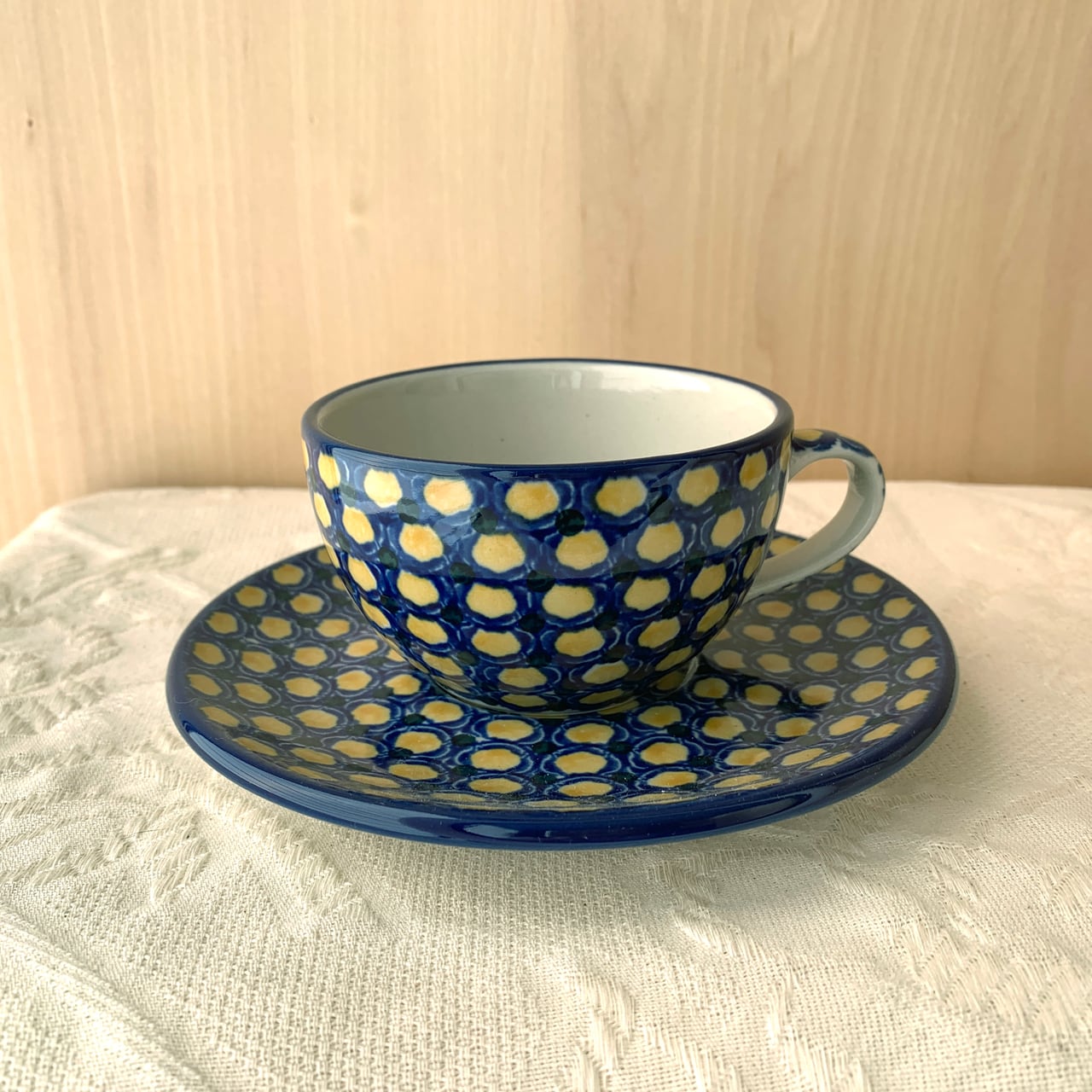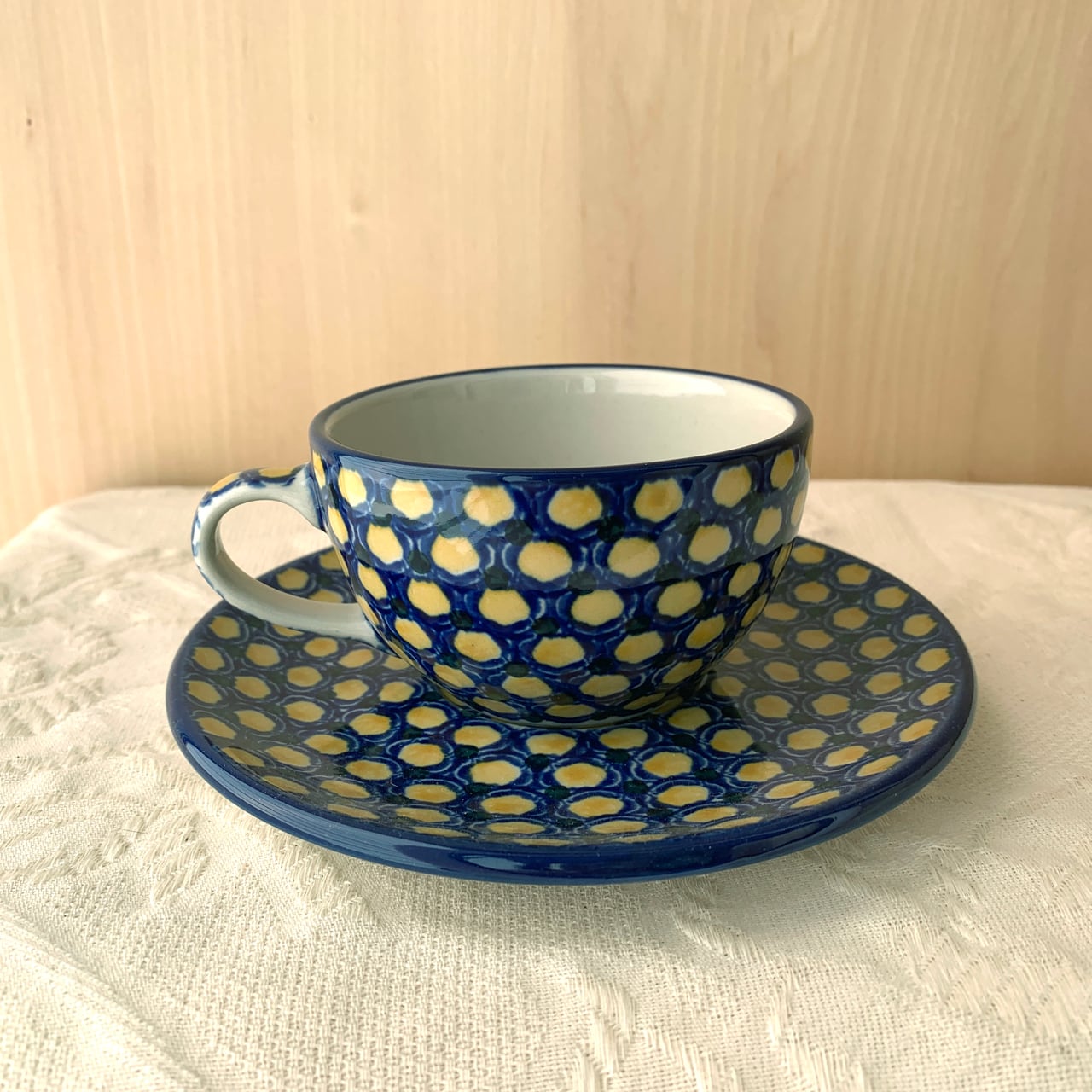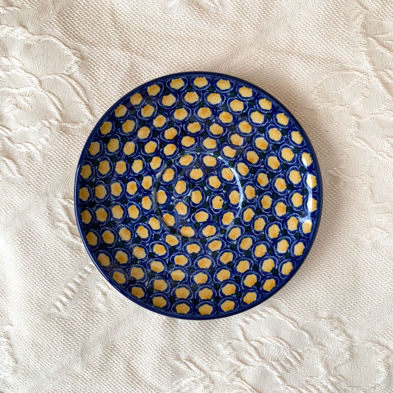 シリーズの名のとおり、コバルト色とイエロー色がお互いに引き立てあっている絵柄です。模様自体は、ポーランド食器伝統の「ピーコックアイ」にも見えます。シンプルで使いやすく、格式もありますので、贈り物にもぴったりです。