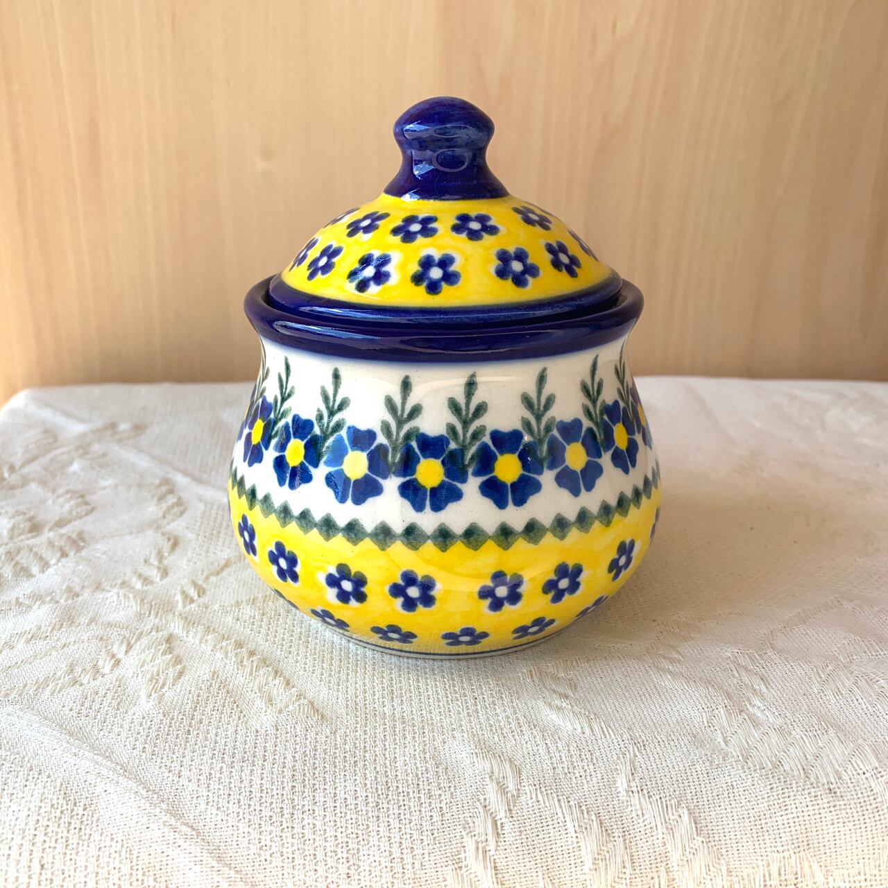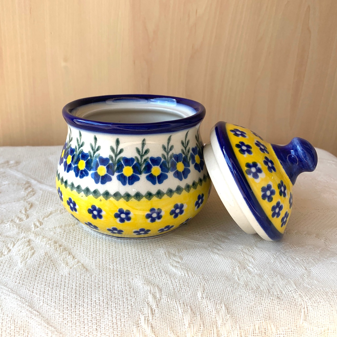 白地と鮮やかな黄色、紺色の花柄がとても華やかなこちらの絵柄。ポーリッシュポタリ―らしい素朴な可愛らしさもあり、見るだけで元気をもらえるようなデザインからとても人気がある絵柄になっています。