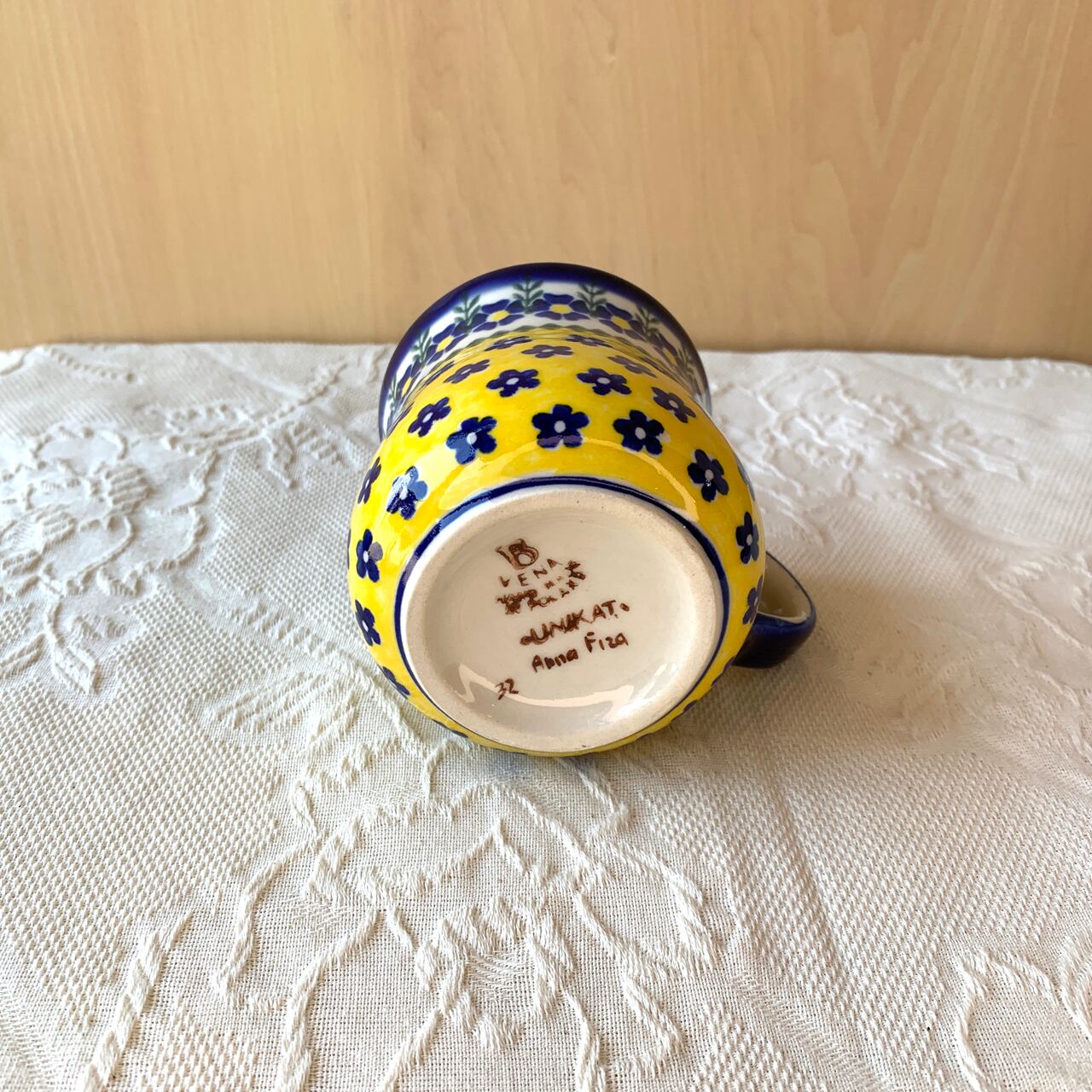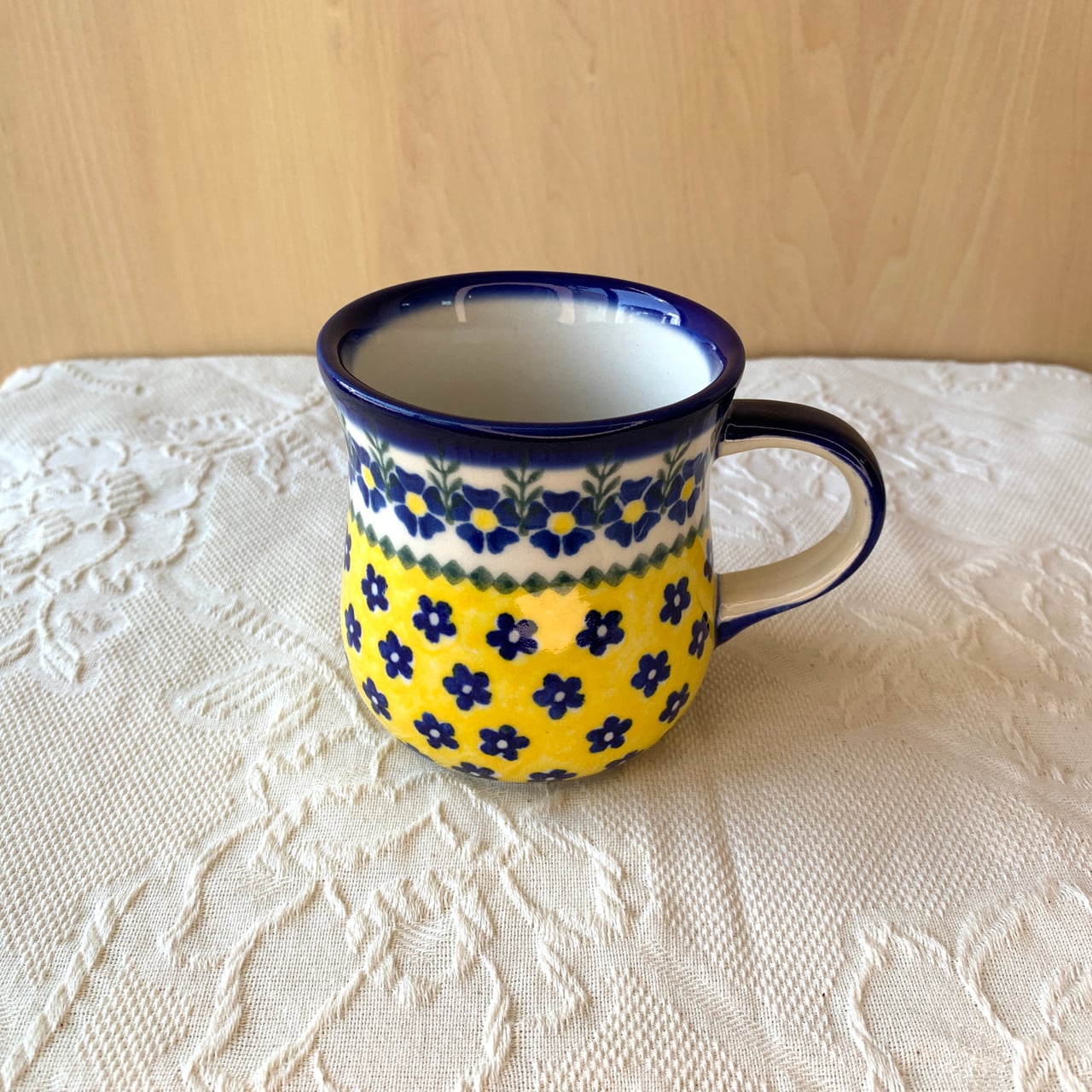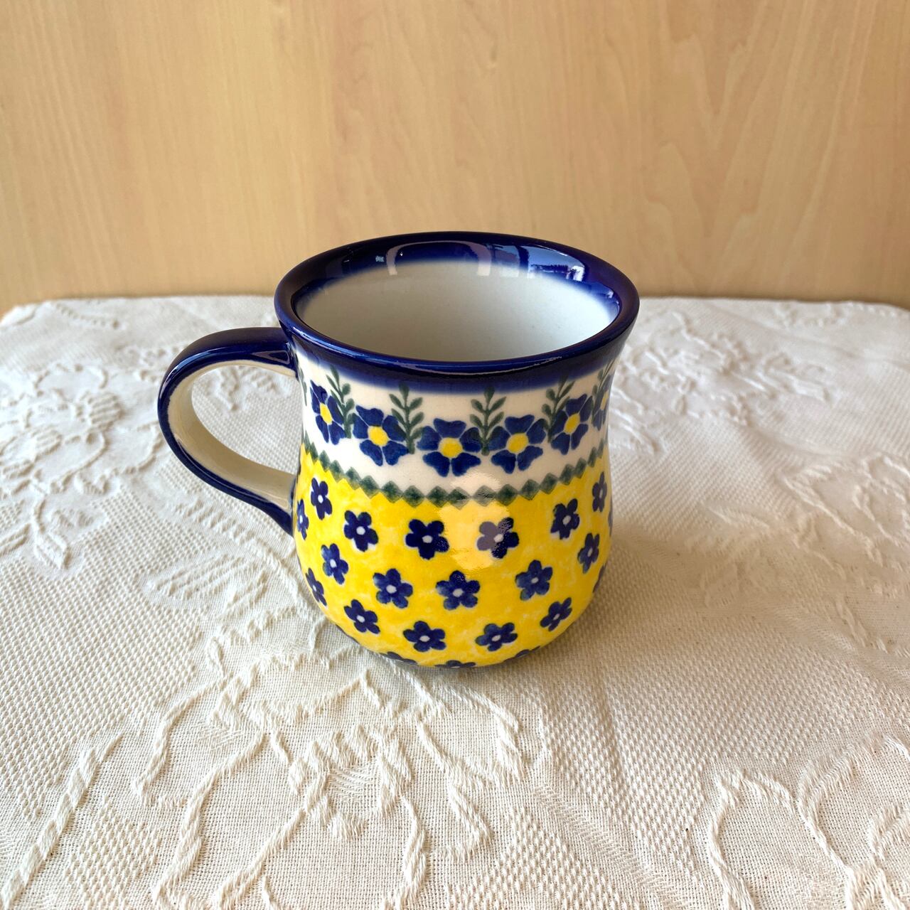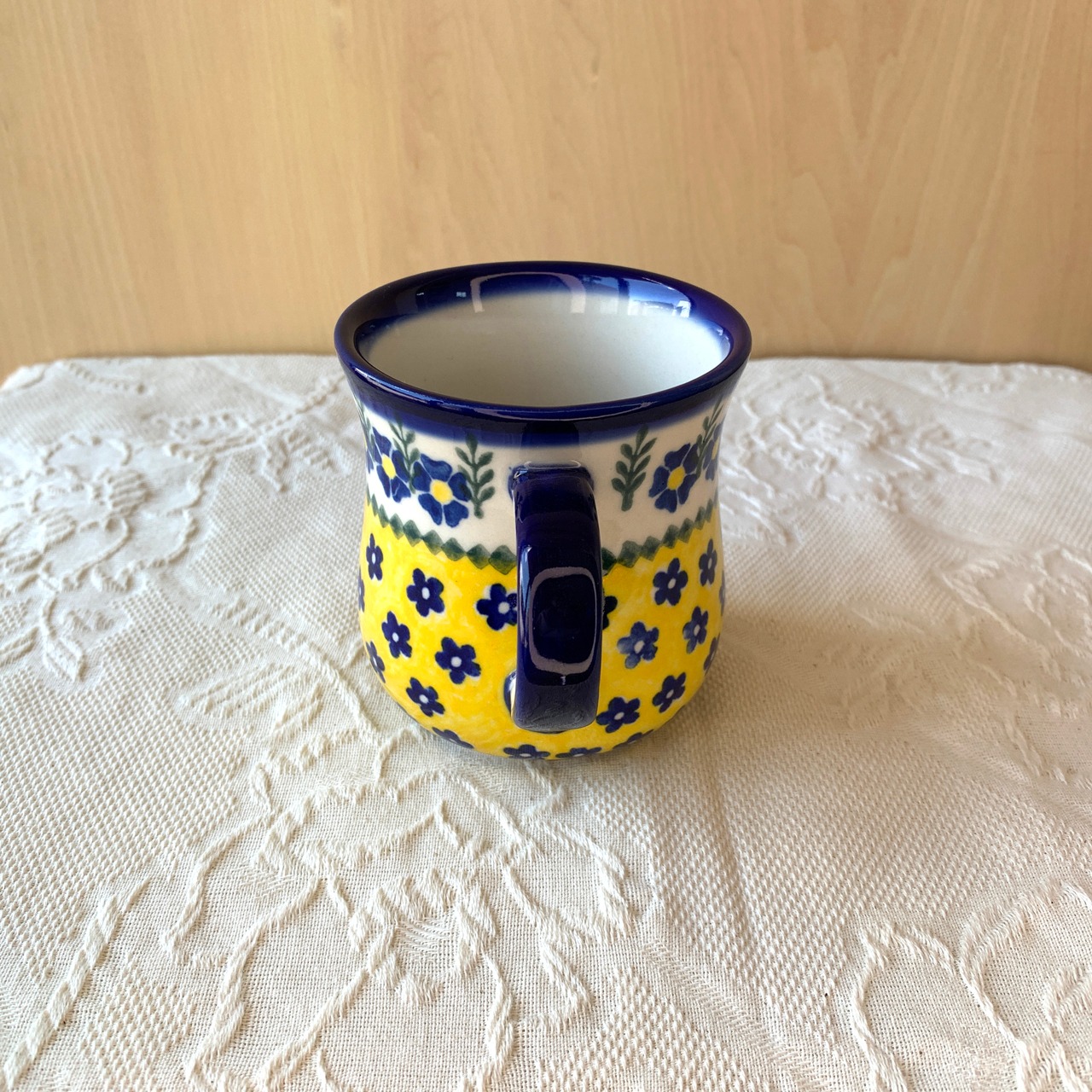 白地と鮮やかな黄色、紺色の花柄がとても華やかなこちらの絵柄。ポーリッシュポタリ―らしい素朴な可愛らしさもあり、見るだけで元気をもらえるようなデザインからとても人気がある絵柄になっています。