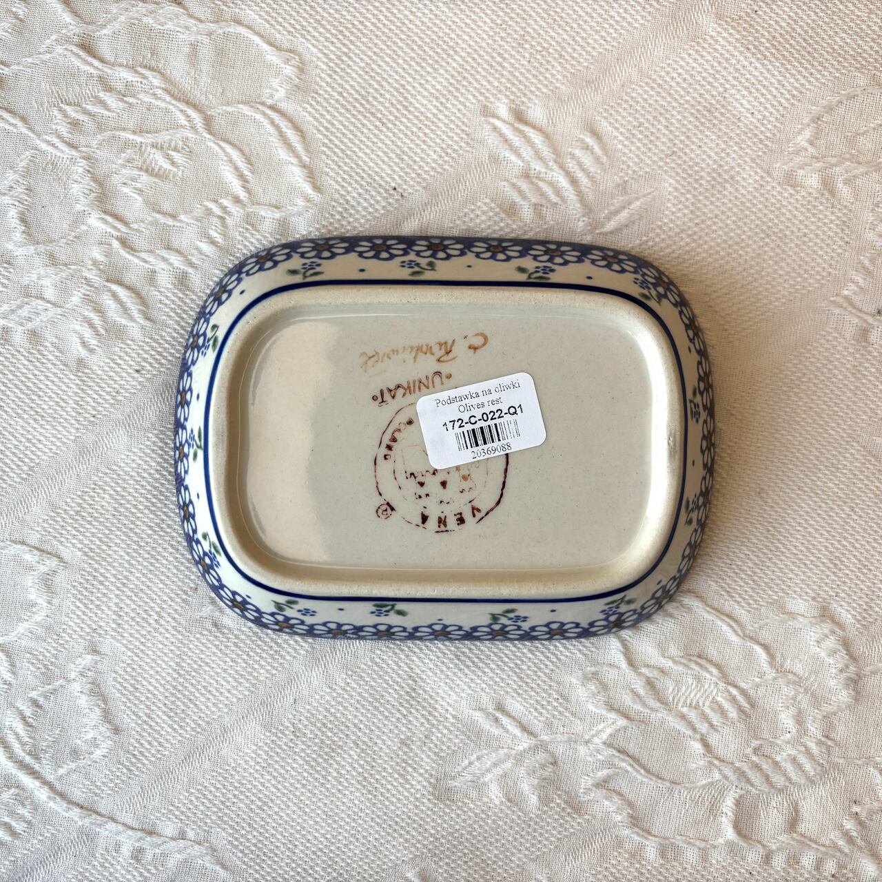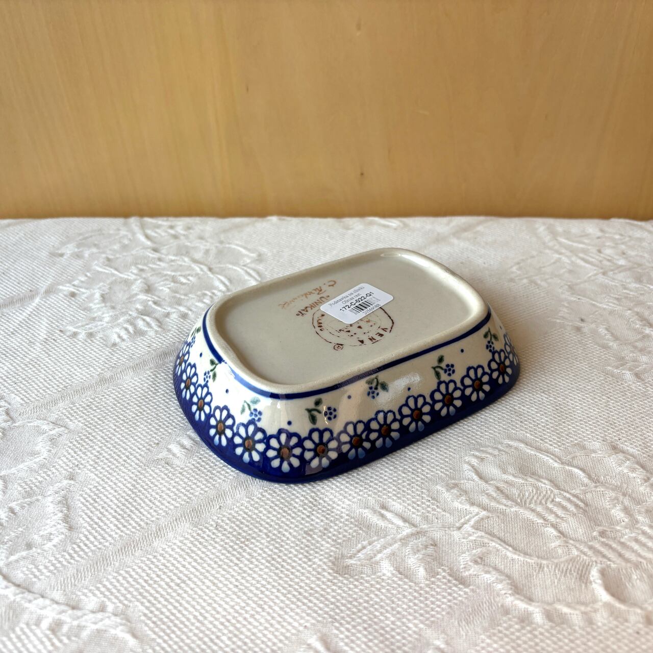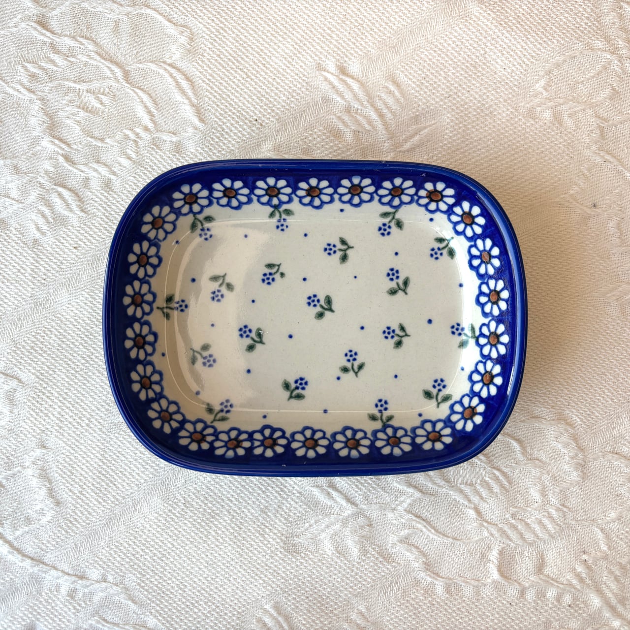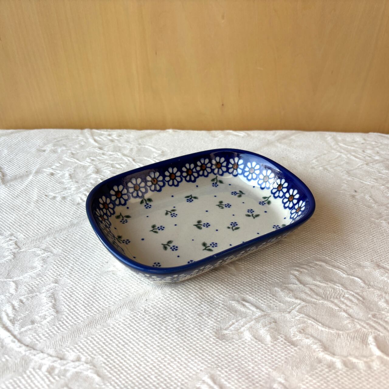 長方形の深さのあるお皿です。現地ポーランドでは「Olive rest」と名のつくプレートなので、オリーブ置きのお皿として丁度良いお皿です。日本の食卓では、小さめのおにぎりが二つほど乗せられる大きさで、深さがあるので汁気のある煮魚や煮物にもご利用頂けるかと思います。