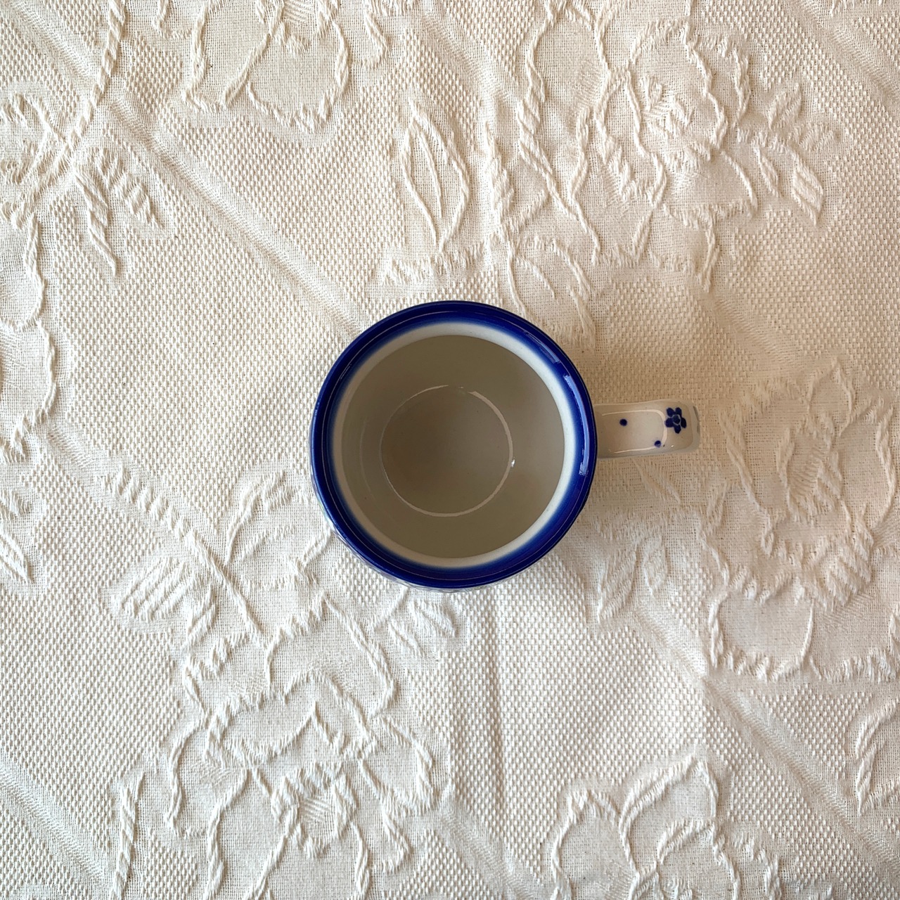 青色を基調に花々が散りばめられたデザイン。白い素地と青色と差し色に入った緑色の配色がさわやかで、可愛さもありながら上品な絵柄になっています。