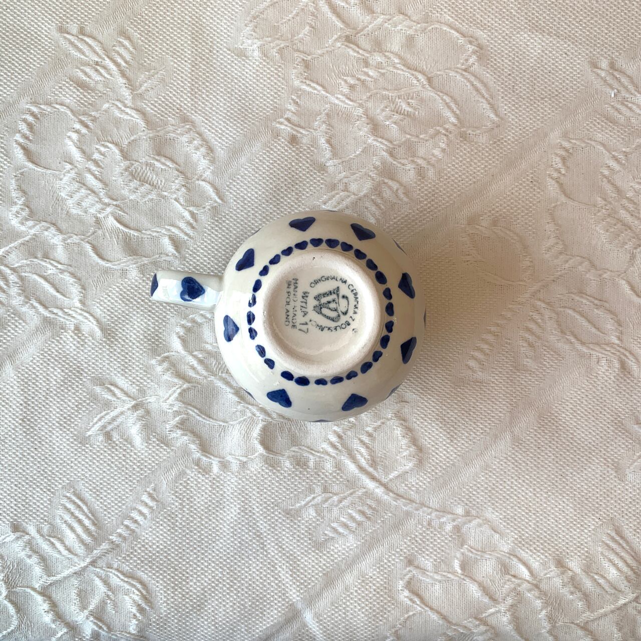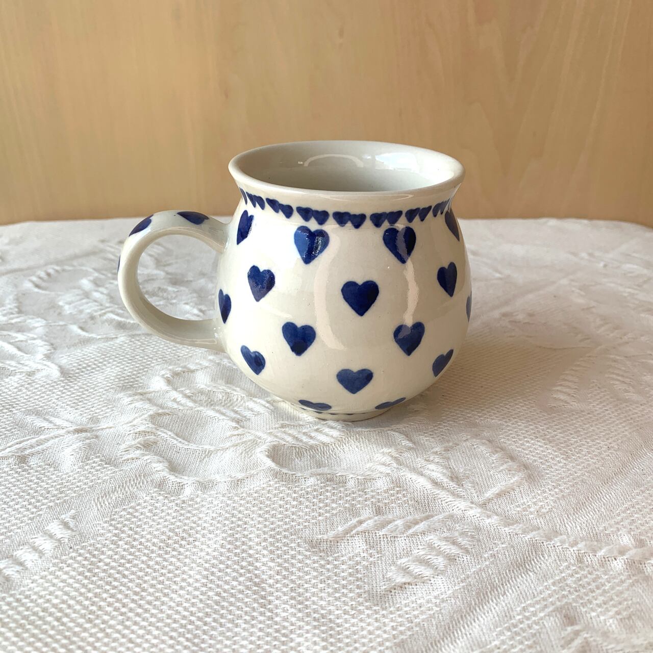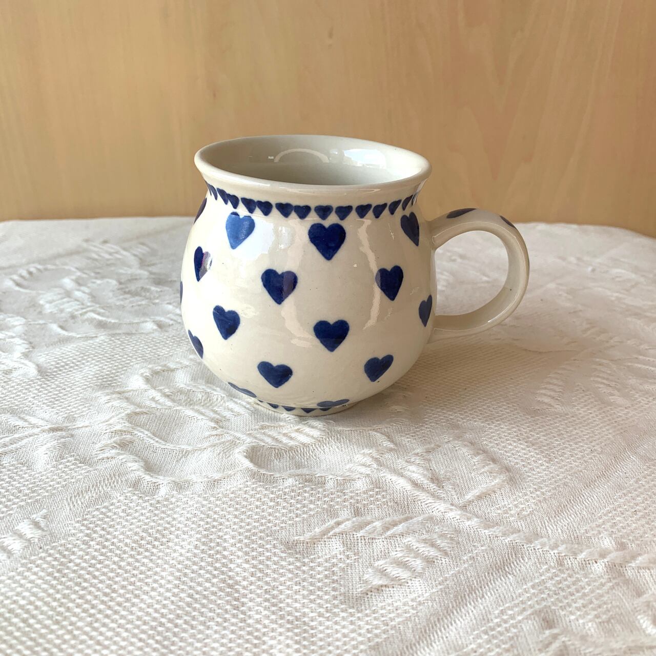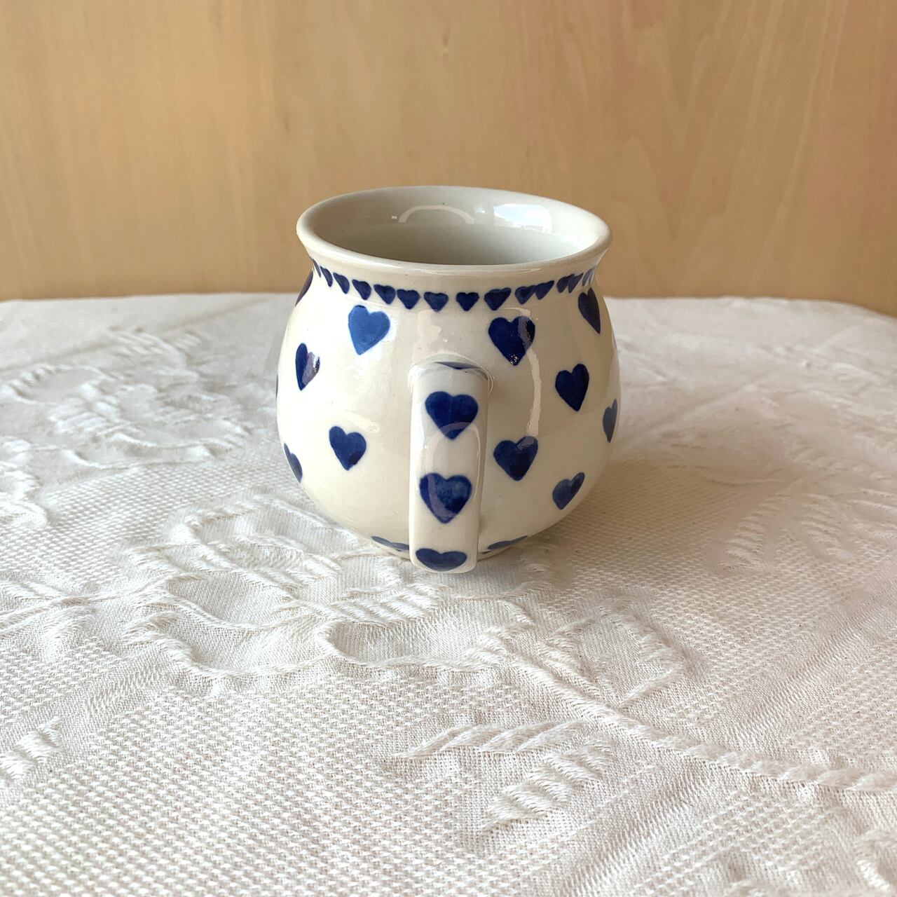 クリーム色の素地に紺色のハートがシンプルにスタンプされているデザインです。縁の周りにぐるっとスタンプされた小さいハートもかわいらしく、シンプルでありながら柔らかいポーランド食器らしい素朴さも兼ね備えた絵柄です。