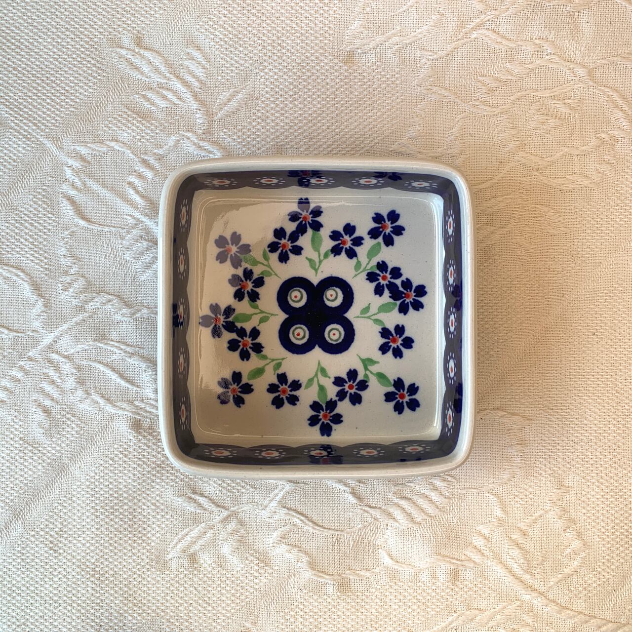 ポーリッシュポタリ―の伝統絵柄であるピーコックアイを元に、可愛らしいお花柄があしらわれたポップなデザイン。伝統的な模様と可愛いお花柄が合わさって、年代問わずに使いやすい絵柄になっています。