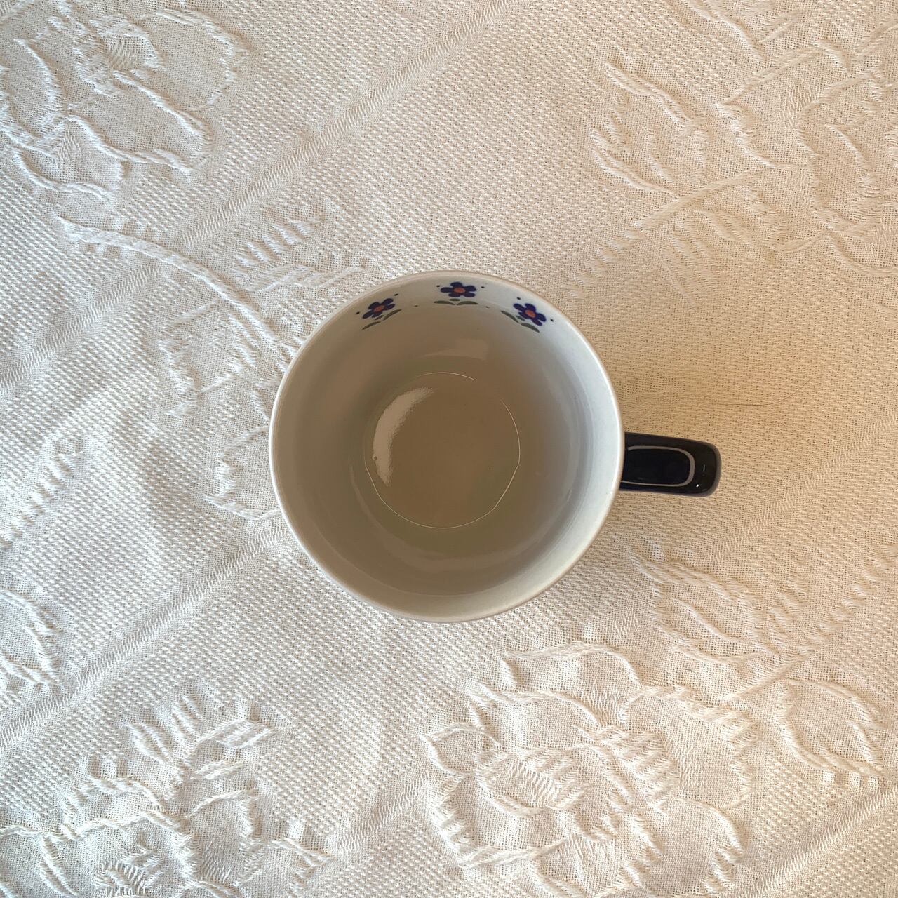 お花のモチーフを主に、何色もの色を重ねて作り出している絵柄ですが、決してくどさを感じない上品で可愛らしいスタンプワークは、製造元であるミレナ社の職人の丁寧な仕事ぶりとデザインの巧みさを感じる絵柄です。