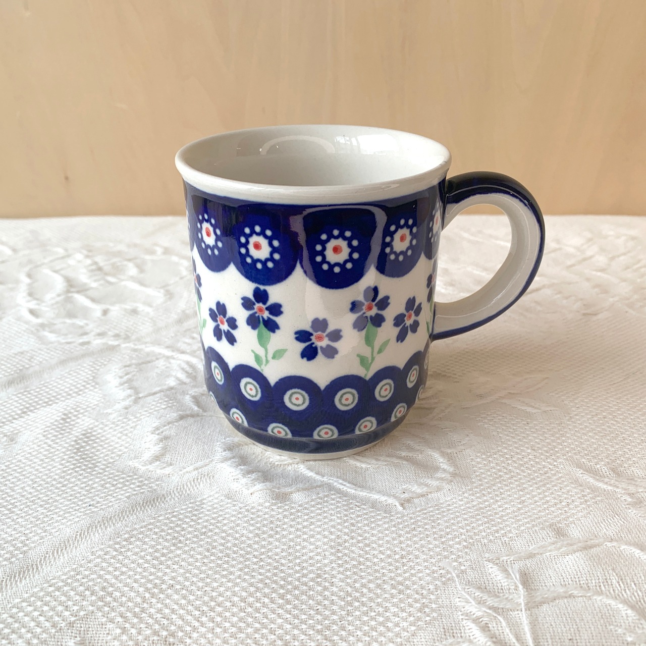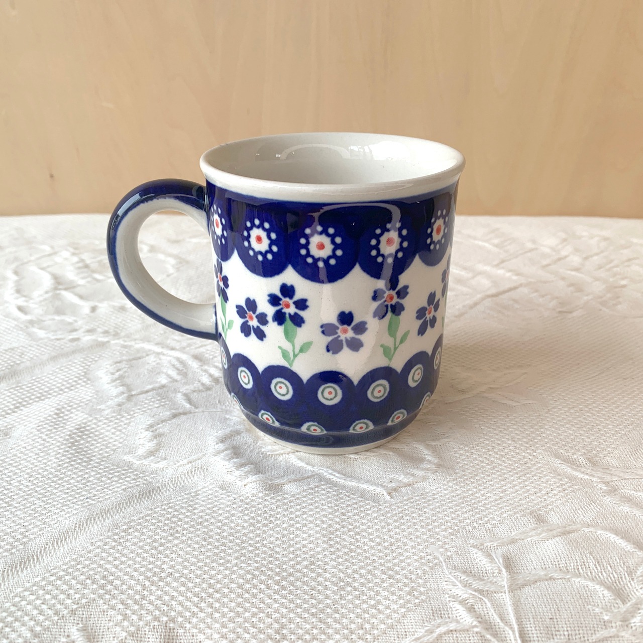 円筒型のストレートなマグカップ。マグカップの形でよくあるオーソドックスなものですが、ポーランド食器らしい柔らかさも感じることのできる素朴な可愛らしさでありながら、シンプルで飽きのこないデザインは、老若男女問わずにご利用頂ける形かと思います。