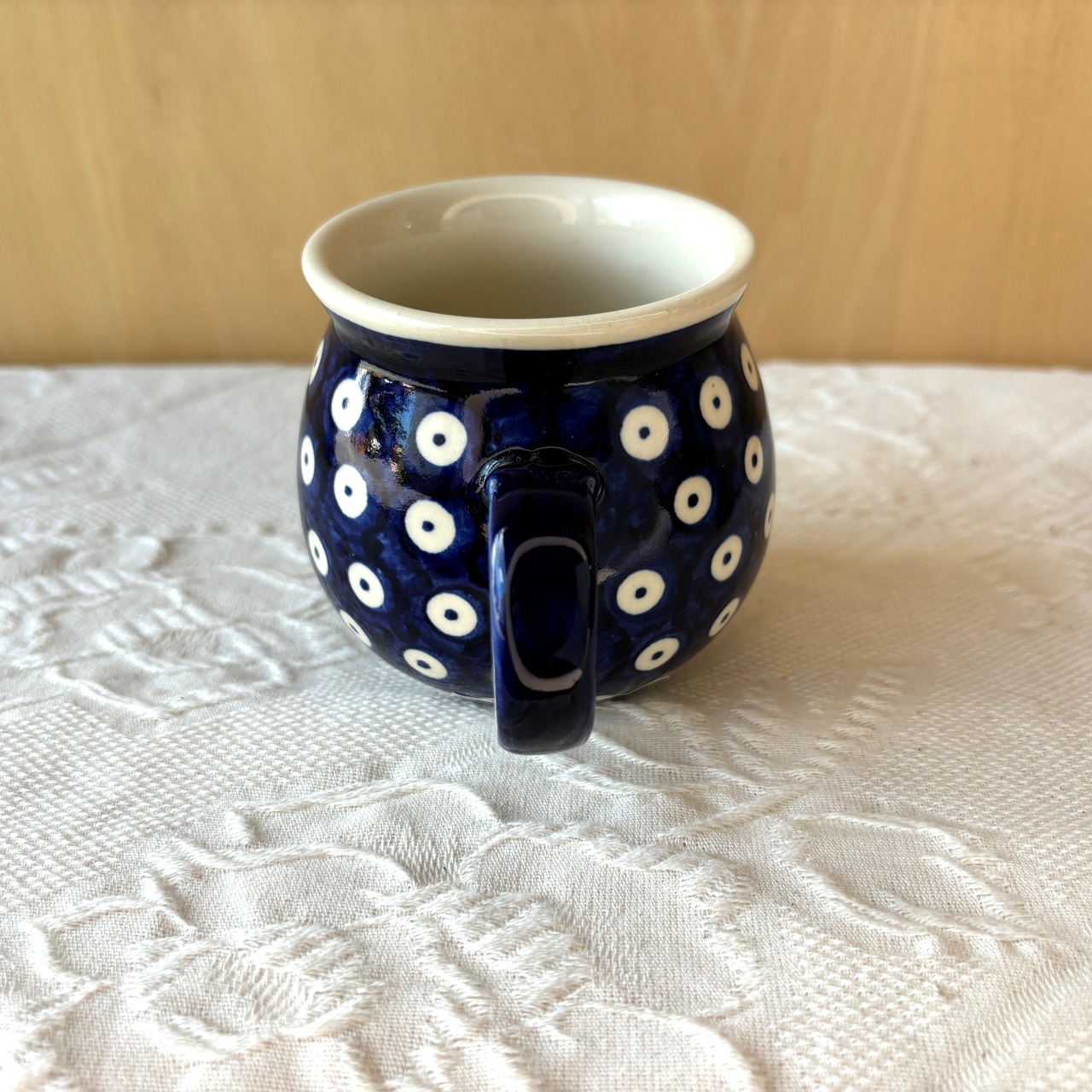 クジャクの羽根の目玉模様を彷彿とさせるモチーフから、「ピーコックアイ」と呼ばれ、ポーランド食器の歴史の中でも長い間愛されてきた絵柄です。数ある窯元メーカーで共通で制作することのできるデザインの一つで、ボレスワヴィエツ陶器の代名詞とも言えます。