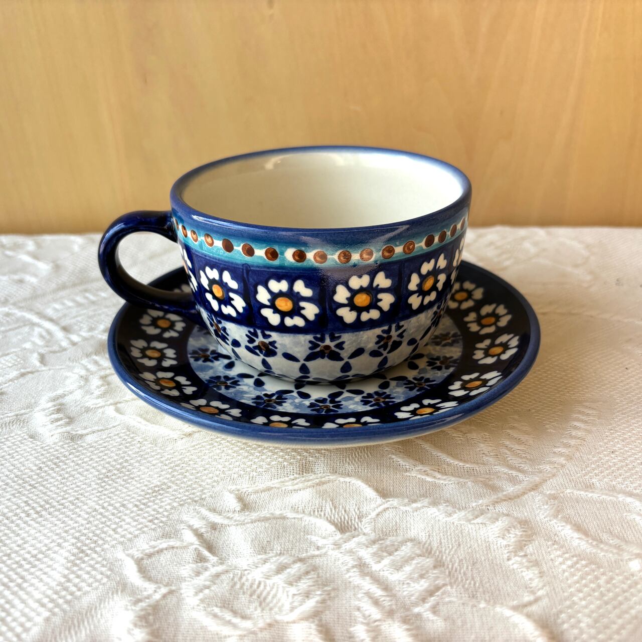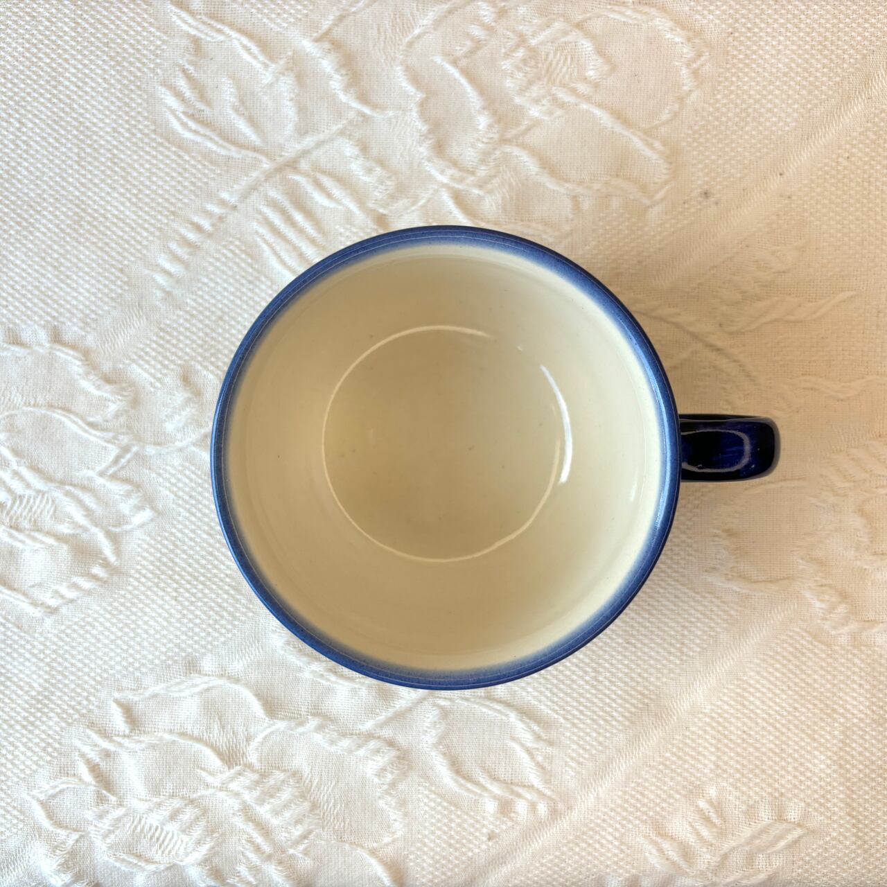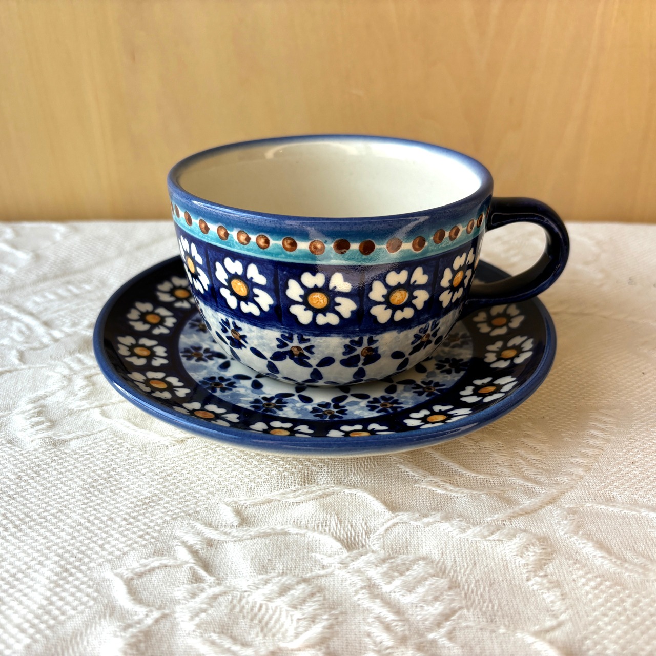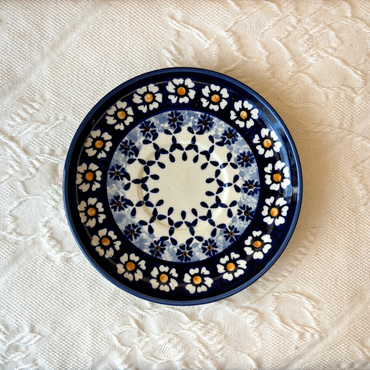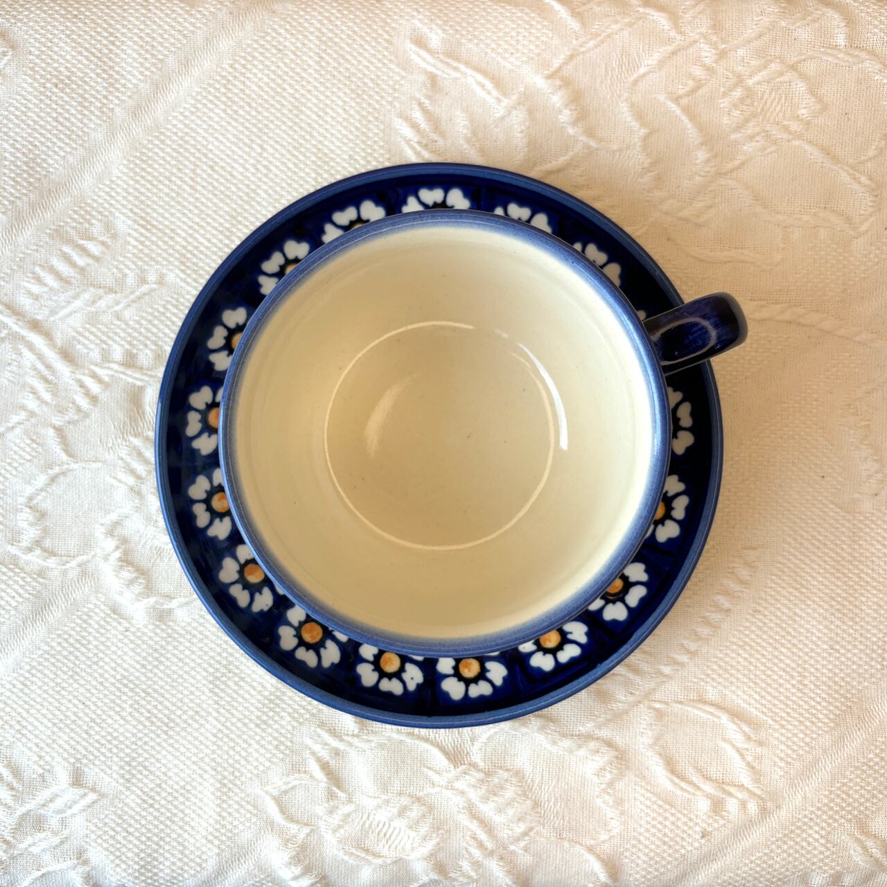 紺色を基調にカモミールが描かれた絵柄です。白いカモミールの真ん中にスタンプされている黄色もアクセントになっていて、とても愛らしいデザインになっています。ポーランド食器を知らない方でも、この柄は知っているという方も多いとても有名な柄です。