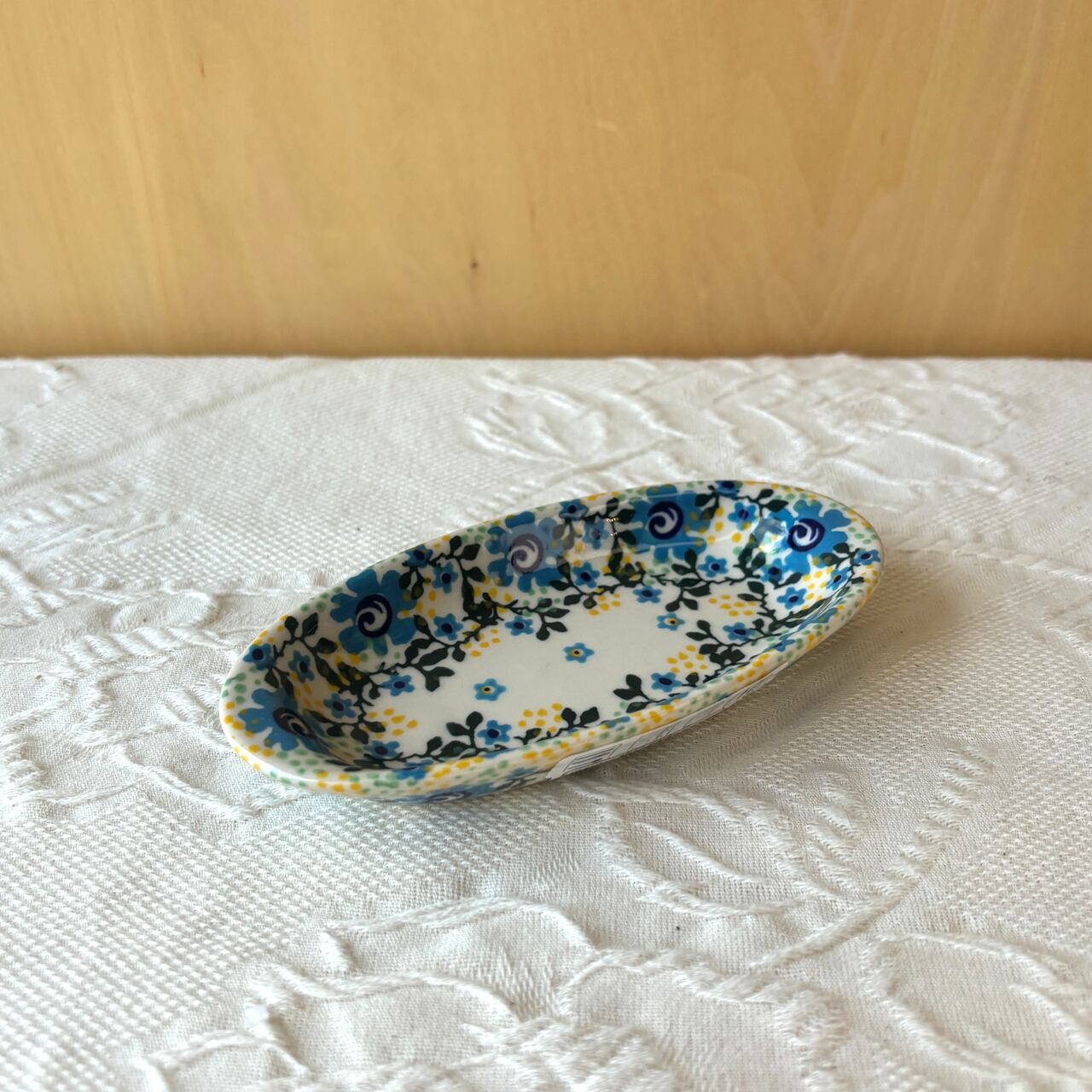 リーフのような形の小さいお皿です。先が少し細まったデザインは、ちょっとしたお菓子や一口デザート、小さなオードブルを乗せて食卓に出すだけで小洒落た雰囲気になります。